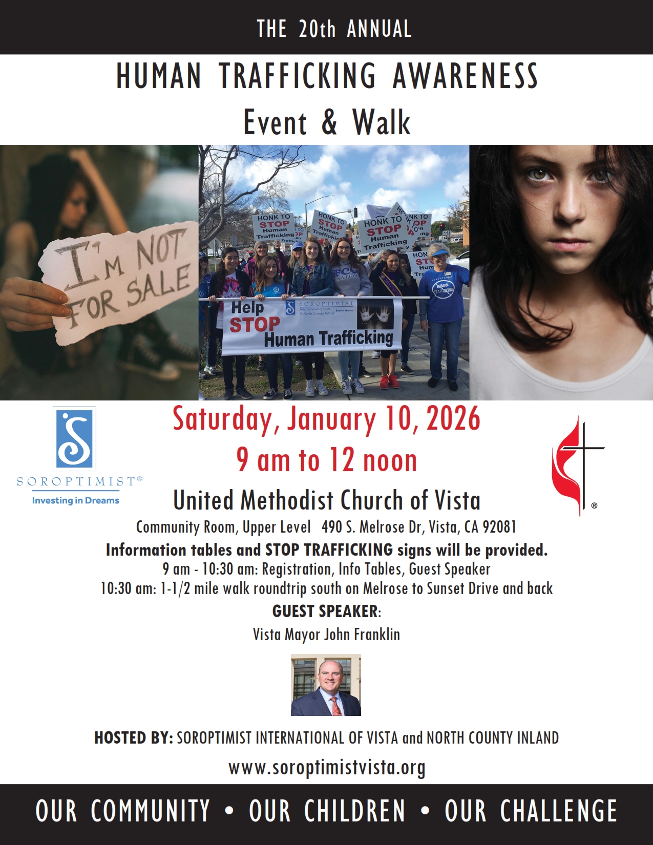 Our club’s annual Human Trafficking Awareness Walk and Event is an in-person event held from in January at the United Methodist Church of Vista, 490 S. Melrose Drive, Vista.
